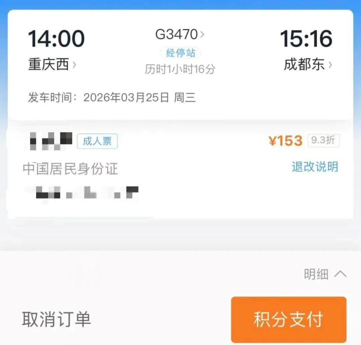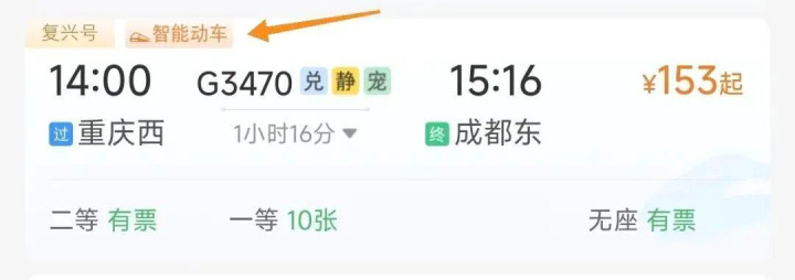 购票界面显示“复兴号+智能动车”:所乘列车属于复兴号家族的“升级款”,是更懂旅客的“智慧高铁”。