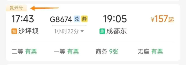 购票界面显示“复兴号”:所乘列车为标准版复兴号,速度快、舒适度高。